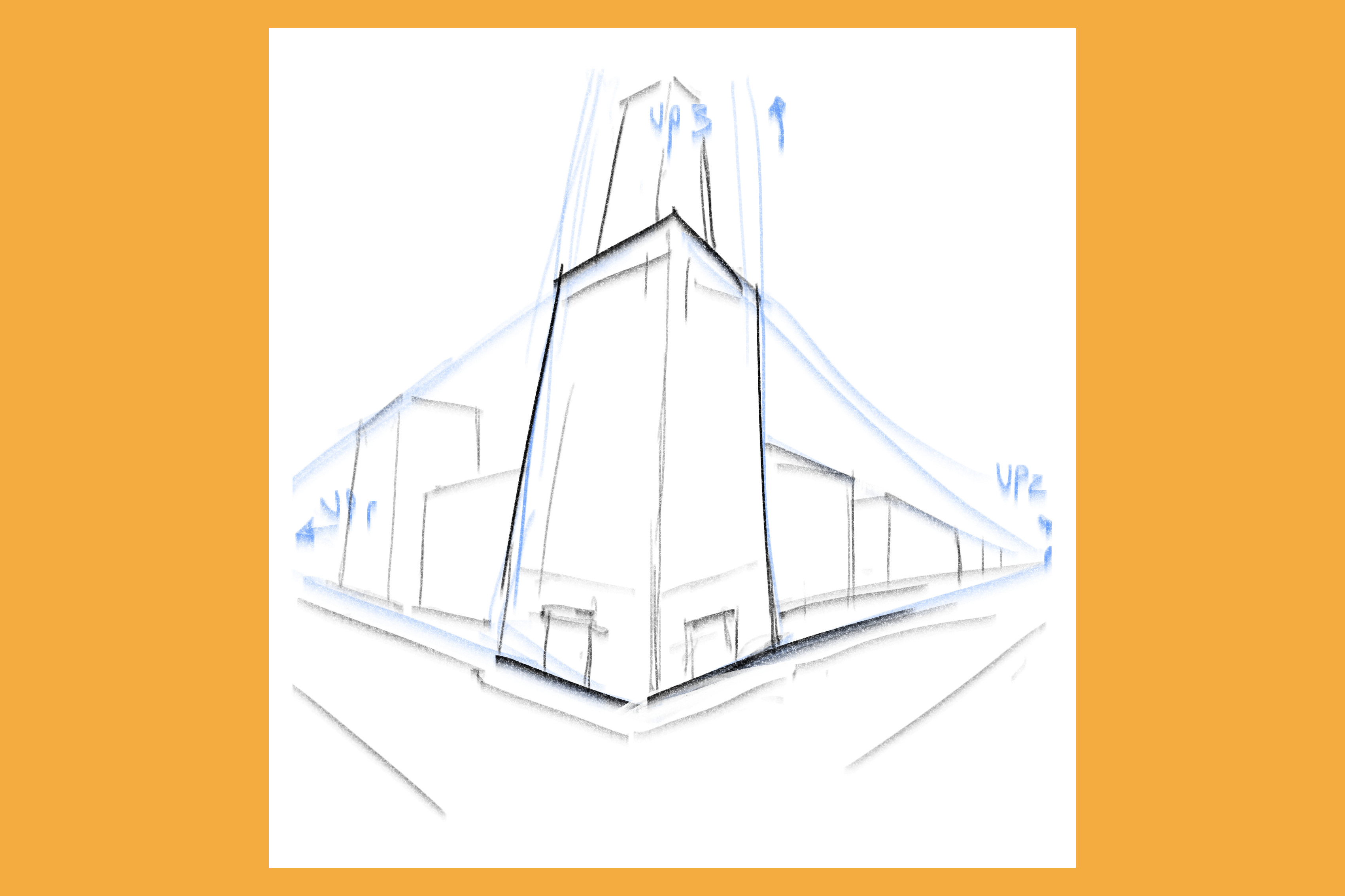As we are in a 3-dimensional world, all three axes or directions are always there, the choice to employ, one-, two- or three-point perspective in our drawing is really about what the major planes (or object’s surfaces) in the artwork are doing and what will help us represent them. For example I’m sure the most common type of 1 point perspective image is of a road going away from the viewer to the horizon. When using all 3 points we must be arranged so that we are close enough to an object (or its big enough) that we see perspective recession occur in all three dimensions or directions – height, width and depth as in the below illustration.